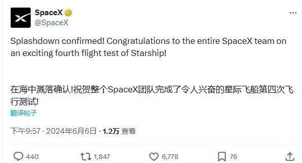 而星舰在绕地球半圈后,成功重返大气层并在印度洋着陆。