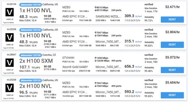 从算力租赁商Vast.ai网站报价可以看到,1x H100的一小时租赁报价确实已经在2~3美元的区间内。