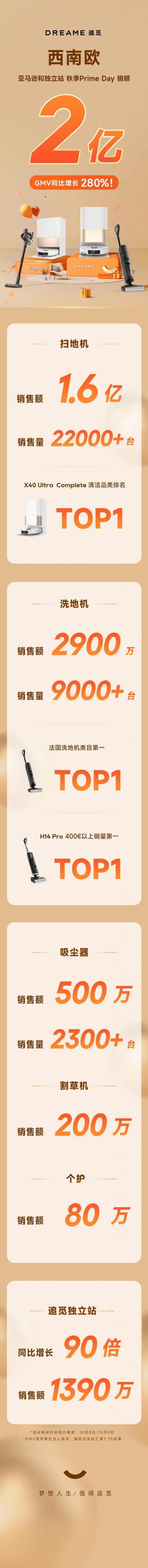 根据最新公布的秋季Prime Day战报,追觅科技在西南欧市场亚马逊和独立站GMV达到2亿,同比增长高达280%!其中独立站同比增长90倍,总GMV1390万,追觅持续拓宽销售渠道的成果初现。