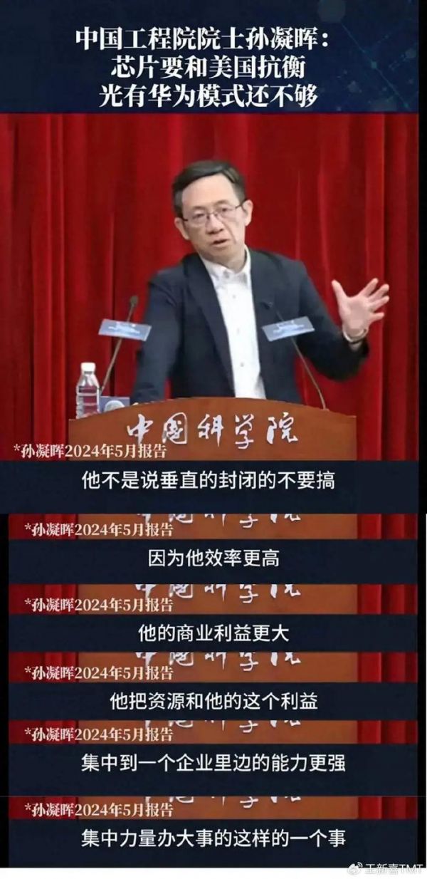 此前中科院孙凝晖院士关于华为模式的观点引发了很大的争议,他指出:“华为就是搞封闭,搞垄断,最好你们都别干,贡献给我就行了。你们都用我的芯片,你们都把技术给我,然后我搞一个端到端的,从这个制造到指令到软件到大模型,到这个应用,反正全都是我,智算中心到什么算力网全都是我,所以我想我们用这种中式的封闭、中式的垄断去对抗人家西式的封闭,西式的垄断啊,肯定是打不赢!”
