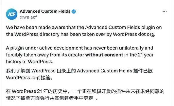 X 平台上的 Wordpess 官方社交媒体频道就发布消息称,对 ACF 进行控制的举动“符合用户在规约中同意的条款”(这些条款指出,WordPress 可以在「未经开发人员同意的情况下,出于公共安全目的而对插件执行变更」)。