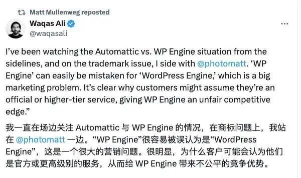 他随后在 9 月 26 日写道,“这不是为了捞钱,而是任何一家通过开源项目赚取到数亿美元的企业都应该担起的回馈要求。 如果他们不这样做,就不能继续使用 WordPress 商标。”