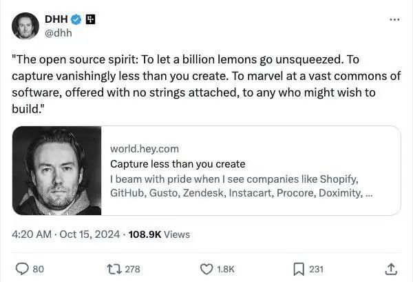 “我创建的开源 Web 框架 Ruby on Rails 已被用于创建总价值数百亿美元的企业。其中一些企业通过提供专职开发人员、加入 The Rails Foundation 或赞助会议来表达他们的感激之情和自身利益。但许多企业并没有这样做!这是他们的绝对权利,即使偶尔会有点令人恼火。”
