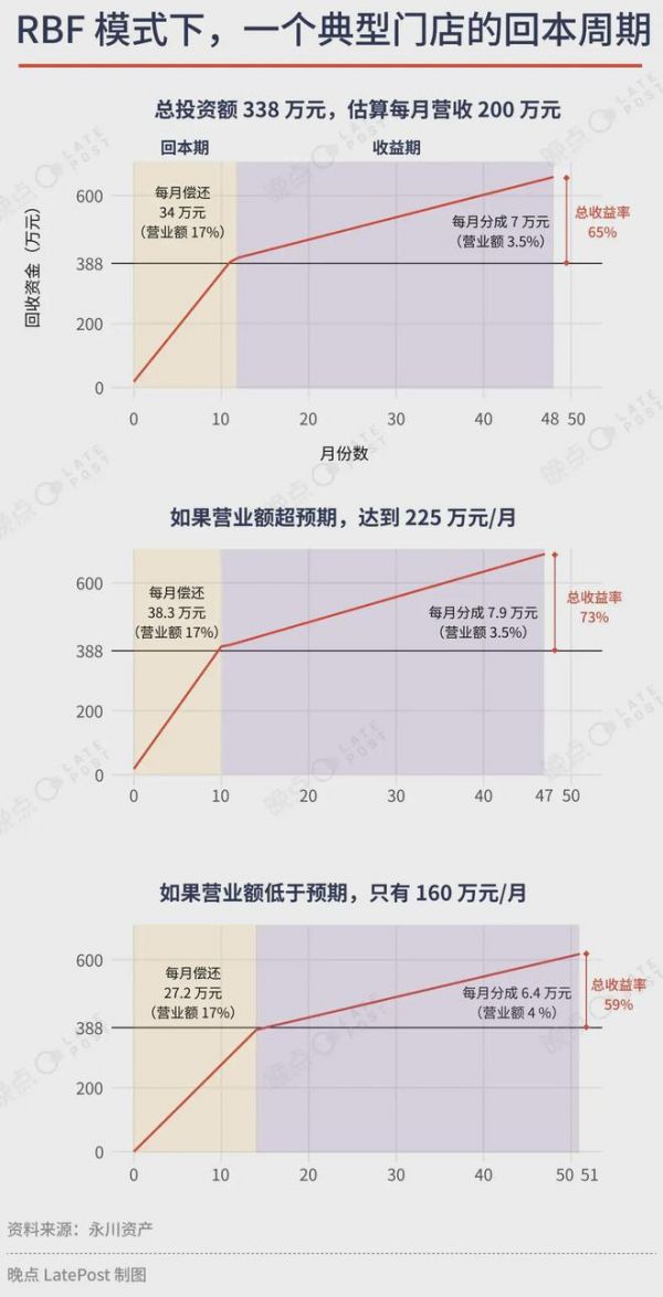 RBF 基金自己开店是前所未有的模式创新,和传统模式比,加盟店的收入不会完全分给 LP。为激励运营团队服务基金,永川给运营公司管理的每间门店设了投资回报率上限。前期,门店每月的利润全部分给基金;达到约定回报之后,运营团队获得门店的后续收益。