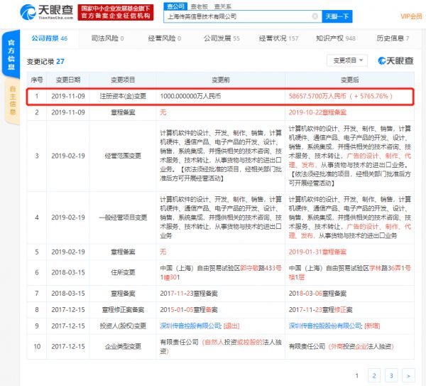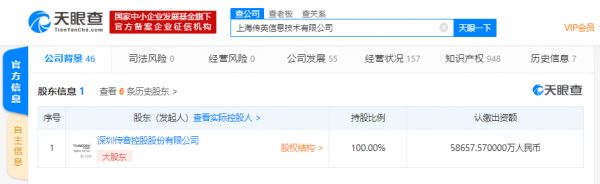 网易科技讯 11月11日消息,天眼查数据显示,上海传英信息技术有限公司发生工商变更,注册资本由1000万人民币新增至约5.87亿,增幅约5766%。该公司由传音控股的运营主体——科创板上市公司深圳传音控股股份有限公司全资控股。