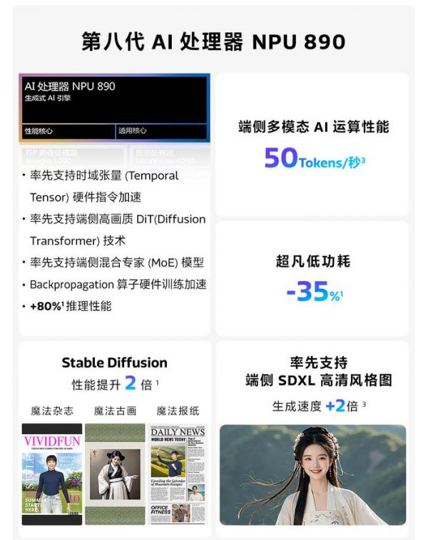 除此之外,手机行业已进入AI时代,天玑9400搭载第八代AI处理器NPU 890。相较于上一代产品,天玑9400的大语言模型提示词处理性能提高80%,功耗降低35%。