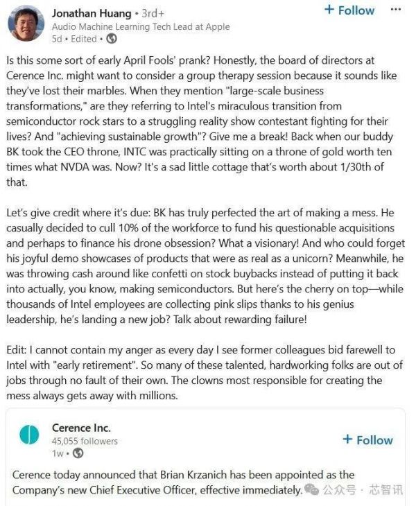 然而,前英特尔研究院的忠实拥护者 Jonathan Huang(现在是苹果公司的技术主管)在LinkedIn上对此评论称,与英伟达相比,英特尔浪费了其潜力。他毫不犹豫地对 Krzanich 进行了一连串的批评,称科再奇“真正完善了制造混乱的艺术”,并且是一位缺乏远见的 CEO。他还指责科再奇使用临时工裁员的资金进行了多次可疑的收购和股票回购。然而,Jonathan Huang最愤怒的是他认为 科再奇主导的收购案中失败的回报,而“有才华、勤奋工作的人失业并不是因为他们自己的错”。