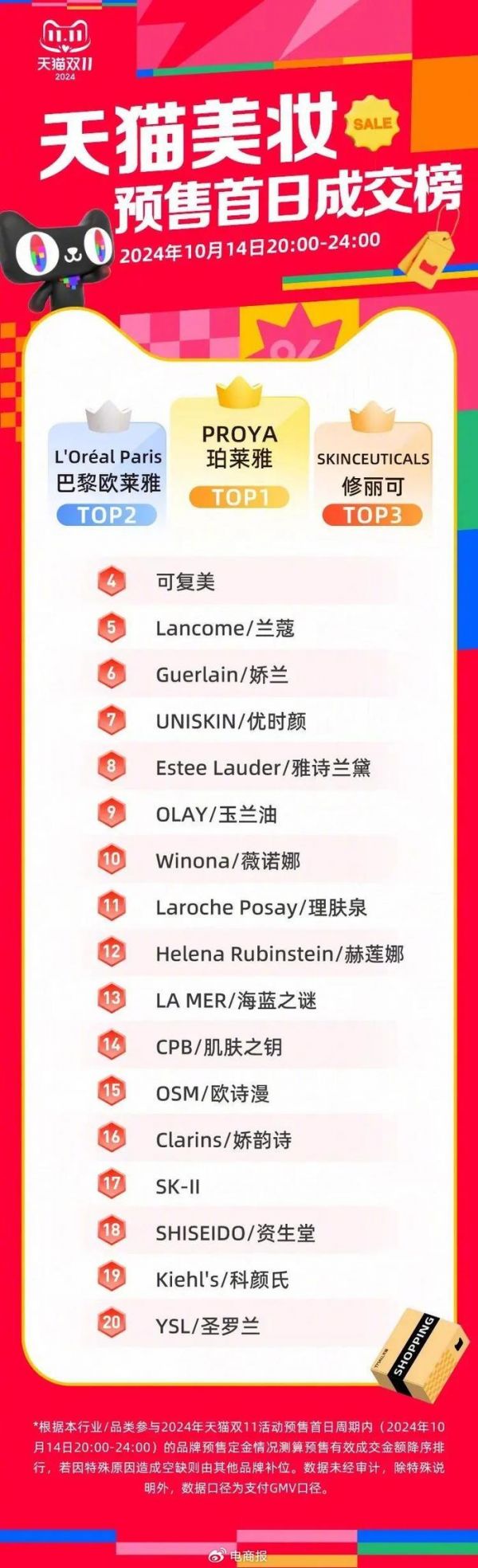 在天猫平台上,美妆品类预售开启后迅速迎来爆发。短短10分钟内,珀莱雅、欧莱雅、修丽可、兰蔻等13个知名品牌成交额相继破亿,前30分钟内破亿品牌数量更是达到了20个。