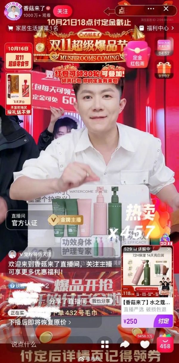 其中,@与辉同行在陕西专场的直播中,累计观看人次达到8740万,带货近400个商品,订单量突破510万。@陈赫直播间在抢先期中爆卖添可V9新品6万多台,@交个朋友双11抢跑首日与9月日均相比,爆发增长超过373%。