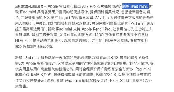 这一代的iPad mini名字很有意思,在苹果商城和苹果新闻稿中,均未提起是iPad mini 7,而是叫新款iPad mini或iPad mini(A17 Pro)。
