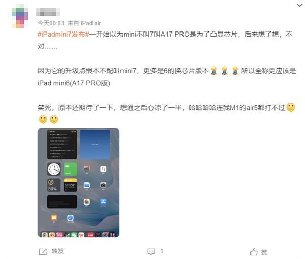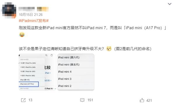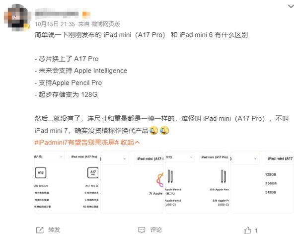有网友表示,“一开始以为mini不叫7叫A17 Pro是为了凸显芯片,后来想了想,不对……因为它的升级点根本不配叫mini 7,更多是6的换芯片版本。”“该不会是果子定位清晰知道自己挤牙膏升级不大?”