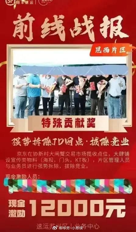 在事情发生之后,顺丰当地业务部门不以为耻,反以为荣,居然还只做了“强势拆除 JD 网点,拔除竞业”的前线战报,甚至现金奖励12000 元,还什么特殊贡献奖,这看起来像是顺丰网点有组织、有预谋的违法破坏行动。