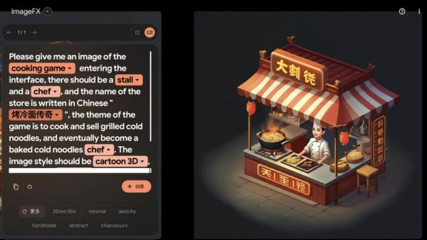 之后,我用微软和谷歌的 AI 生成图像平台,输入了我对游戏界面的要求,虽然生成的中文店铺名还是鬼画符,但猛一看还真有烹饪手游的风格了。