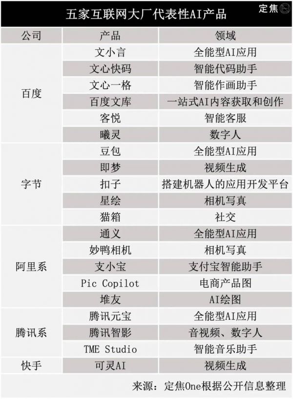根据公开信息,“定焦One”梳理出了近两年来,五家大厂各自具备代表性的toB、toC类AI应用产品。