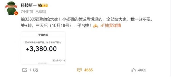 10月14日,数码博主“科技新一”发文称:小杨哥的美诚月饼昨晚给退钱了,据所展示的截图,“科技新一”已经收到了三只羊的退款到账3380元。