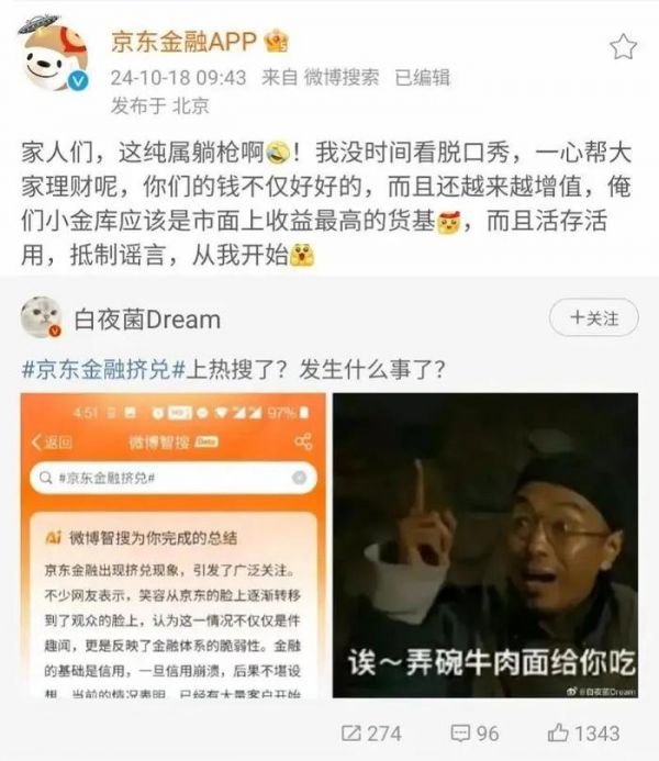 10月14日,脱口秀演员杨笠参与京东的活动,京东还发布消息称,京东买药将与杨笠展开合作。随后网上开始出现大批量呼吁对京东plus会员发起退款,以作为抵制。同时有传言称,不少消费者向京东金融发起挤兑。