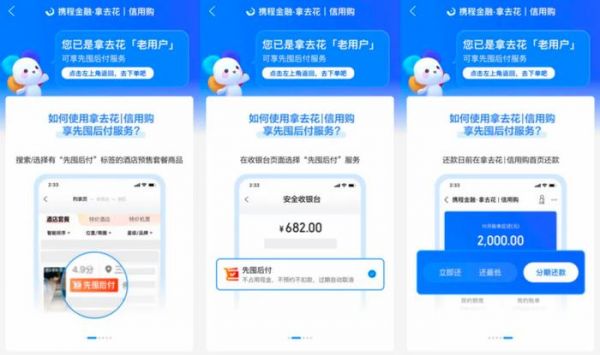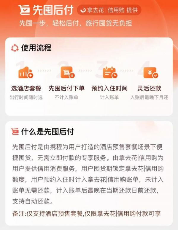 但OTA的市场,吸引用户最重要,卧榻之侧岂容他人用独家优势开香槟。经过一段时间的建设,携程终于基于旗下拿去花|信用购服务,正式推出了先囤后付功能——“0元下单,预约入住后下一个月再付款”,全面对标飞猪和花呗的组合。