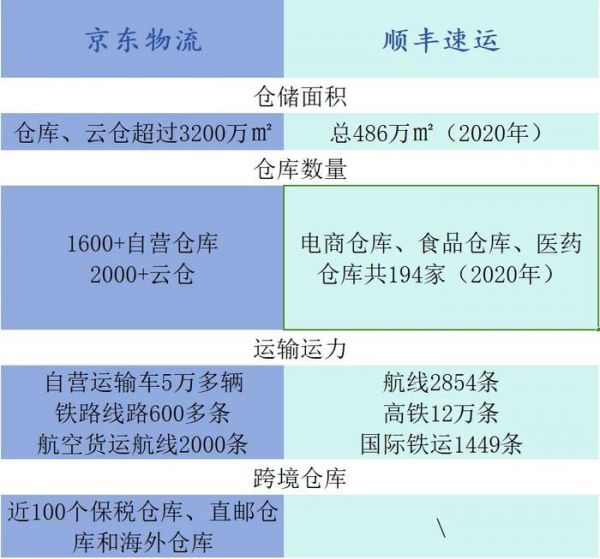 仓储面积:京东物流包括自营仓库、云仓,总面积超过3200万平方米。顺丰最新财报未有披露,2020年仓储面积总计为486万平方米。