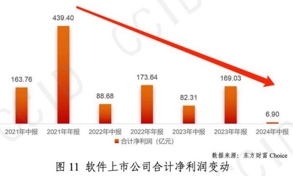 数据来源:上市公司 2024 年H1 财报赛迪的一份报告也显示,中国上市软件公司的总体利润已连续 3 年下滑,而且2024 年上半年同比下滑了 91.62%,可谓相当惨烈。