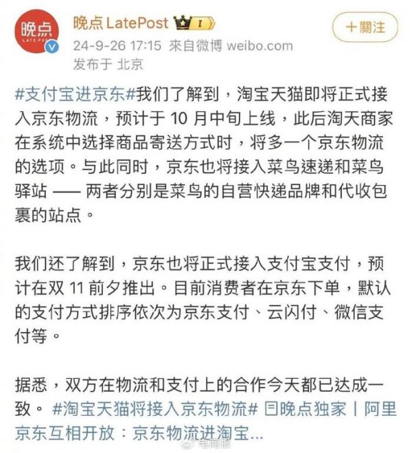 近日,又有消息称,淘宝天猫计划接入京东物流系统,为商家新增物流选项,预计于10月中旬上线。