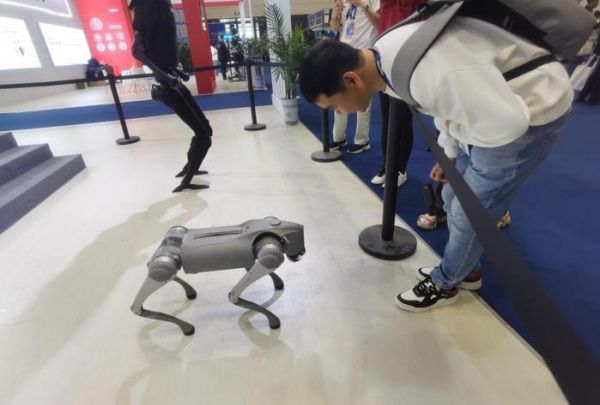 “你好,笨笨,比个心吧!”在人工智能展区一处展位前,一位参观的市民朝着地上的机器狗喊着。话音刚落,只见机器狗突然直立身体,用两条前腿摆出了一个“心形”姿势,引来不少参观者纷纷与机器狗互动。