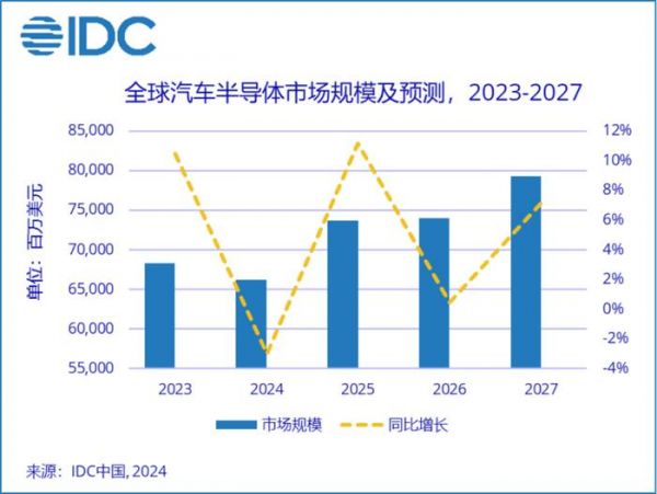 此外,随着全球汽车销量放缓,IDC对2024-2027年汽车芯片市场的预测进行了调整,到2027年,汽车半导体整体规模将超过792亿美金。整体的预测数据如下图所示。