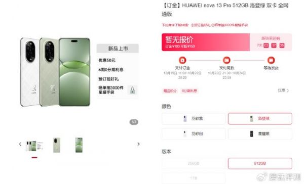 此外,根据华为商城预约界面显示,除了洛登绿配色外,华为nova 13系列还提供有羽砂紫、羽砂白、星耀黑配色可选,结合对称排列的椭圆形星耀环设计,整体外观颜值可谓是相当在线。