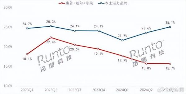 近年来,国际品牌在中国市场却遭遇了前所未有的挑战。洛图科技(RUNTO)发布的线上监测数据显示,截至2024年Q3,包括惠普、戴尔和苹果在内的三大国际品牌在中国线上渠道的销量份额降至15.7%。