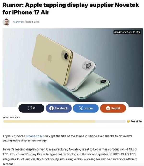 有了TDDI技术的加持,iPhone 17 Air可实现更薄的OLED显示屏。