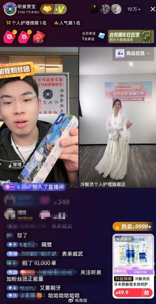 另外,听泉此前还多次与冷酸灵的主播进行连线PK,冷酸灵官方账号也发布了多条在听泉直播间刷礼物的视频内容。