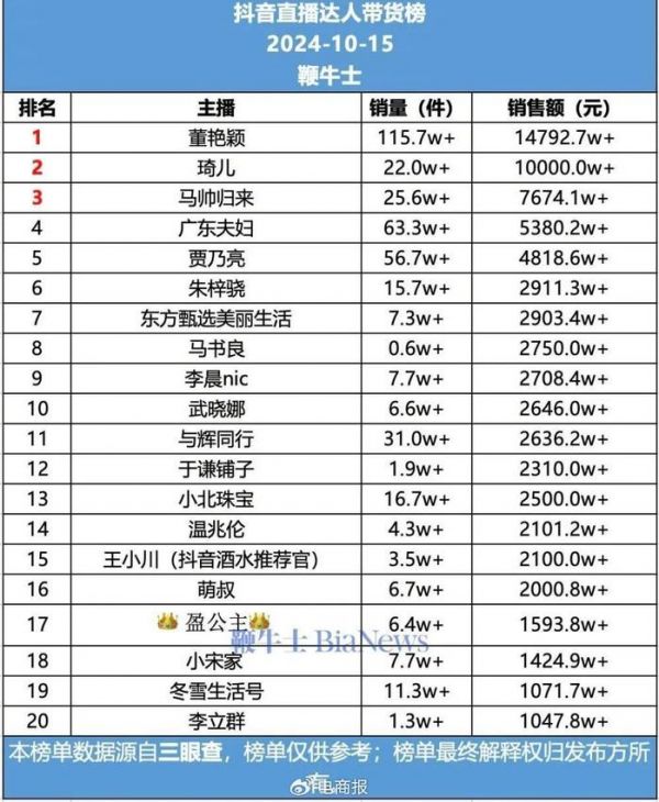 10月15日,主播董艳颖悄然崭露头角,一举拿下抖音平台销冠。据鞭牛士的抖音数据显示,当日董艳颖的销售额接近1.5亿元,销量超过115.7万件,力压广东夫妇、贾乃亮、与辉同行等知名主播,登顶直播带货日榜。