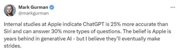知名苹果爆料记者Mark Gurman发文称,苹果公司内部的一些员工也认为苹果在AI领域已经落后了。这些内部员工研究发现,OpenAI的ChatGPT比苹果的Siri准确度高出25%,并且能回答的问题多出30%。有员工甚至认为苹果的生成式AI技术(至少现阶段)落后于行业领先公司两年以上。