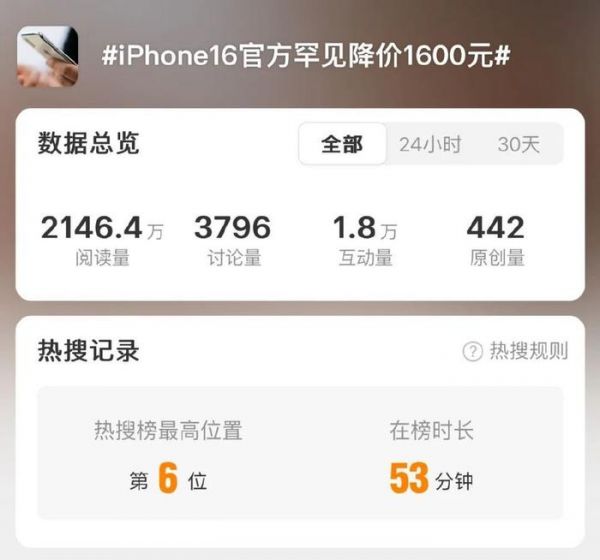 很快,微博相关话题#iPhone 16官方罕见降价1600元#冲上热搜,引发网友热议。