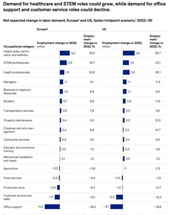 哪怕是那些不怎么被影响的产业如医疗健康领域,内部岗位需求也有所变化,比如医疗领域里增长的是专业研究人员、医生和提供情绪价值的护工们,而办公室支持岗位则会迅速下降。