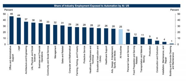 高盛的《人工智能对经济增长的潜在大规模影响》就提到:在美国,文职工作中可以自动化的任务比例最高,为46%,其次是法律工作,为44%,建筑和工程中的任务为37%。生命、物理和社会科学领域紧随其后,为36%,商业和金融业务以35%位居前五。