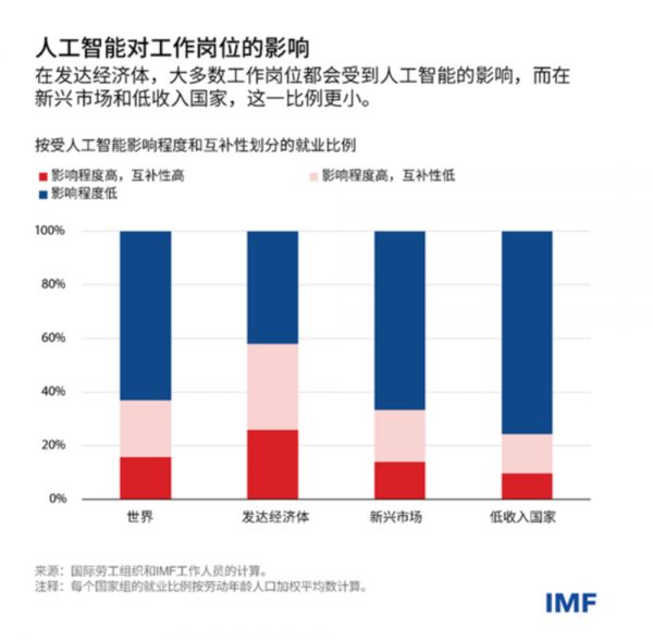 IMF也提到,在发达经济体,大约60%的工作岗位可能受到人工智能的影响,而在新兴市场和低收入国家,受到人工智能影响的工作岗位预计分别占40%和26%。