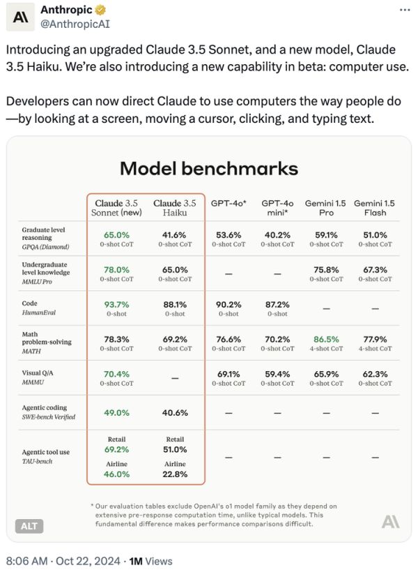 升级版在保持原有价格和速度的同时,获得了早期用户的高度评价。包括GitLab和The Browser Company等企业都证实,升级后的Claude 3.5 Sonnet在多步骤开发和网页工作流中的表现超越了他们之前测试过的所有模型。(Cursor快接入吧,你将更能打。)