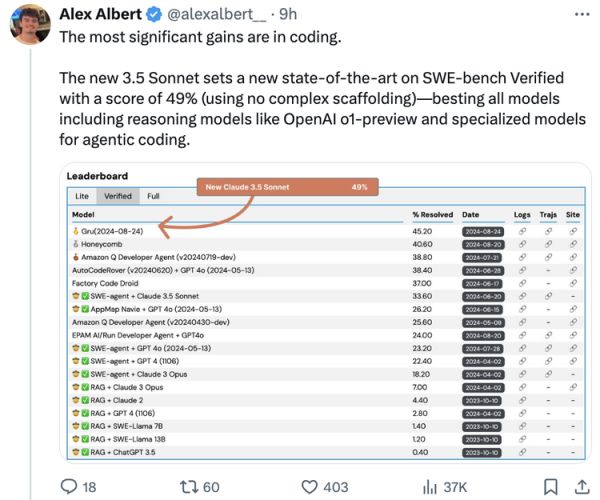 在SWE-bench Verified测试中,它的编程分数从33.4%提升到了49.0%,超越所有公开可用的模型——包括OpenAI o1-preview等推理模型和专门设计的主动编程系统。在TAU-bench(一个主动工具使用任务)测试中,零售领域的表现从62.6%提升到69.2%,难度更高的航空领域则从36.0%提升到46.0%。