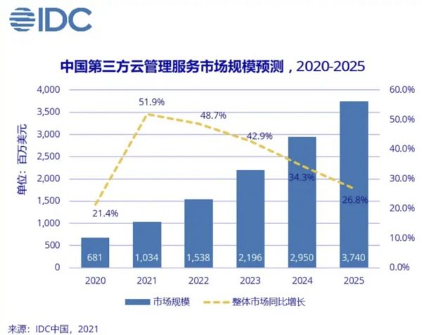 IDC数据显示,2020年,中国第三方云管理服务市场规模为6.81亿美元,预计2025年将增长至37.4亿美元,年复合增长率为40.59%。用户的前瞻性不言而喻,但问题依然在于新的技术浪潮,总是会出现新的竞争对手。