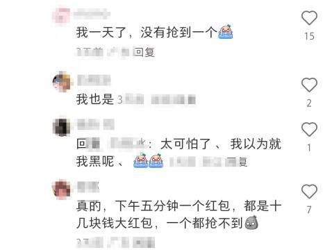 这两个数字显然是对不上号的。不少网友也表示,“蹲了一天,根本抢不到”“5分钟一个红包,一个都抢不到”……