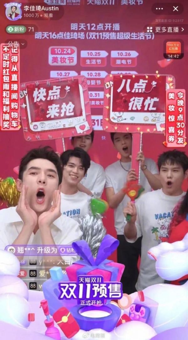 10月14日晚8点,双11开启预售,李佳琦直播间累计上线500个链接,涵盖美妆、宠物、母婴、家电、服饰等热门品类。