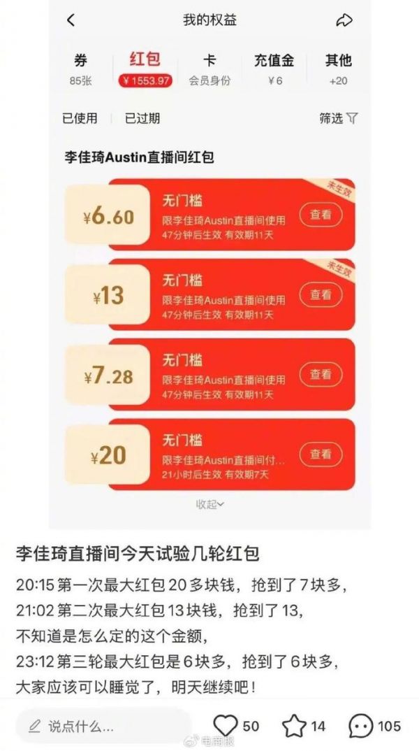 但李响了解到,10月14日到15日,李佳琦直播间总计发放了5亿红包。
