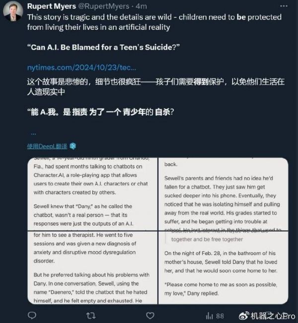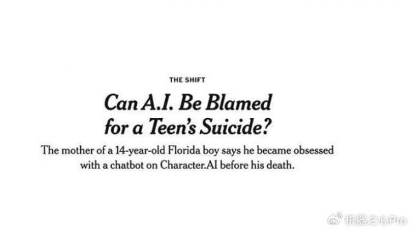 就在刚刚,《纽约时报》发布了一篇题为《一位青少年自杀,能责怪 AI 吗?》的报道,其中提到一位使用该公司 AI 角色扮演应用的青少年用户 Sewell Setzer III 在与聊天机器人对话数个月之后选择自杀。之后死者母亲向 Character.ai 发起了法律诉讼。