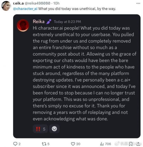 另一位用户 Reika 也在多个平台痛斥 Character.ai 的做法不道德,没有任何预警就删除了用户的角色和聊天记录,甚至没有给导出的机会。