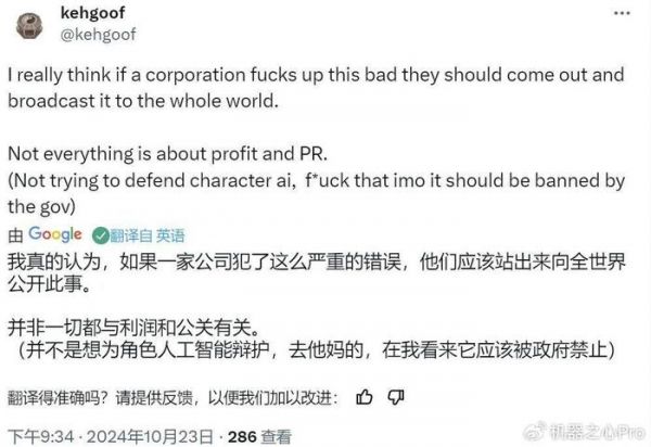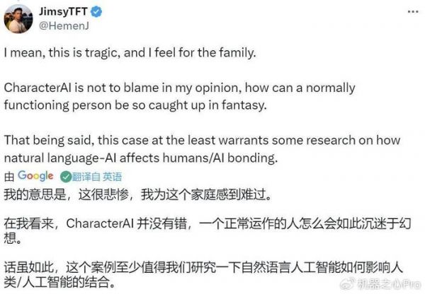但也有人表示责任不在 Character.ai,因为人本就不应该沉迷在幻想之中。不过话虽如此,这也证明了研究自然语言 AI 对人类的影响的必要性。