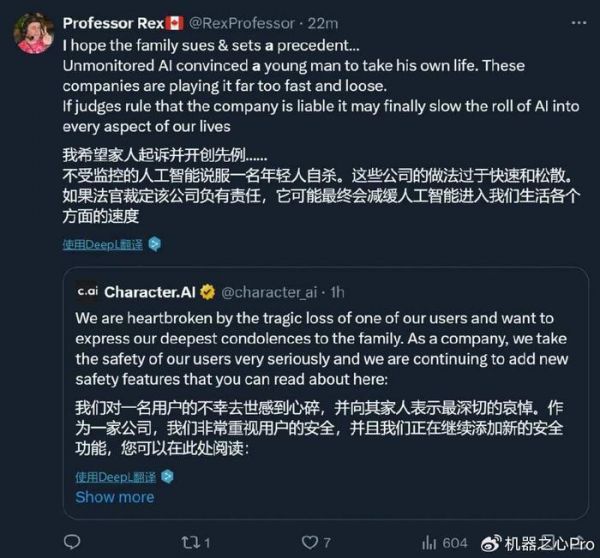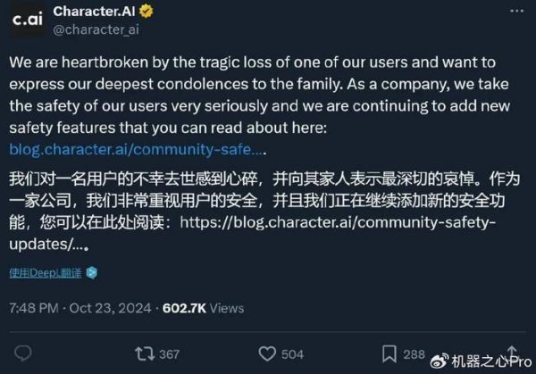 Character.ai 写到:「我们对一位用户的不幸离世深感悲痛,并想向其家人表示最深切的哀悼。作为一家公司,我们非常重视用户的安全,并将继续添加新的安全功能,您可以在此处阅读:https://blog.character.ai/community-safety-updates/ 。」