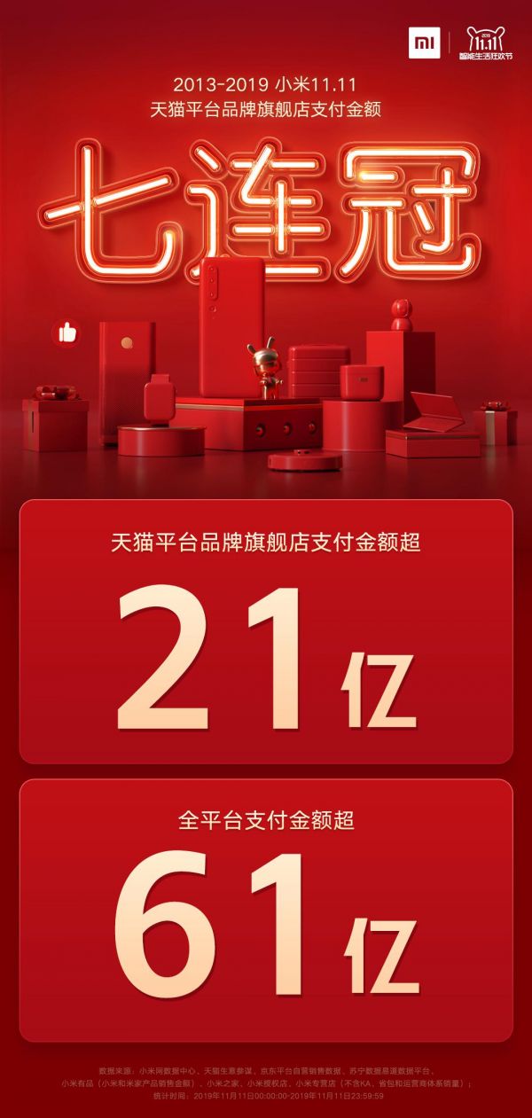 小米战报显示小米天猫平台品牌旗舰店支付金额超过21亿,实现了七连冠。小米特意强调了小米品牌店铺成交额占了天猫平台总成交额近1%。小米全平台支付金额超过61亿元。