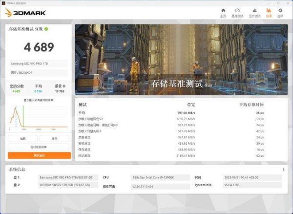 首先是3DMARK存储基准测试,可以看到,三星990 PRO的综合得分达到4689,平均带宽达到797.08MB/s,平均延迟低至38us,可轻松应对《战地风云5》《守望先锋》这种类型的游戏,实际的游戏性能表现非常出色。