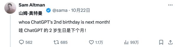 第二条推文:哇,ChatGPT下个月就两岁了!