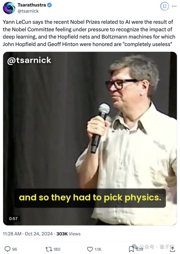 借此话茬,LeCun突然被问到“你怎么看最近的物理诺贝尔奖呢”。